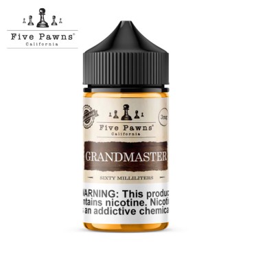 Voici un e-liquide élaboré par Five?Pawns, conditionné en flacon de 60ml (format Unicorn Bottle). Le Grandmaster mêle des saveurs de beurre de cacahuète, de crème de banane et de caramel dans une base 50/50 PGVG.