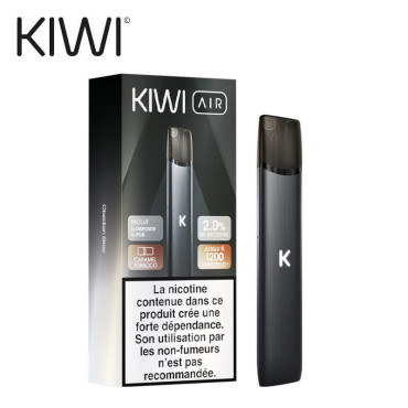 Le Starter Kit Kiwi Air Obsidian Grey Caramel Tobacco Kiwi Vapor offre jusqu’à 1200 puffs et un tirage MTL automatique pratique pour les fumeurs en transition.